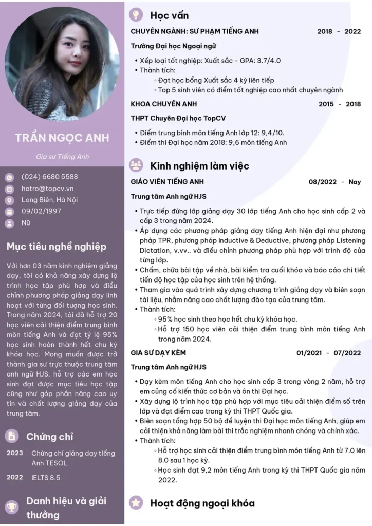 | Mục tiêu nghề nghiệp | 3–5 dòng | Hỗ trợ học sinh mất gốc đạt 6,5+ sau 12 tuần | Viết để “kiếm thêm thu nhập” |